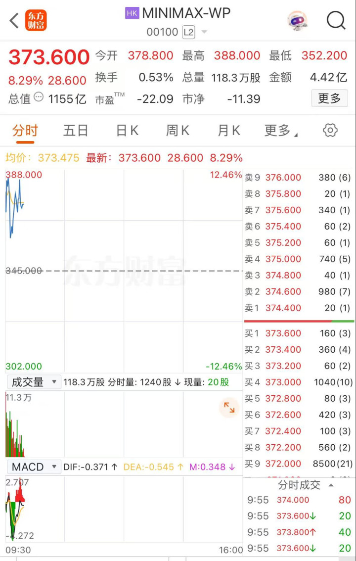 截至9时55分,智谱涨15.13%,报182.6港元/股;MINIMAX-WP涨8.29%,报373.6港元/股。