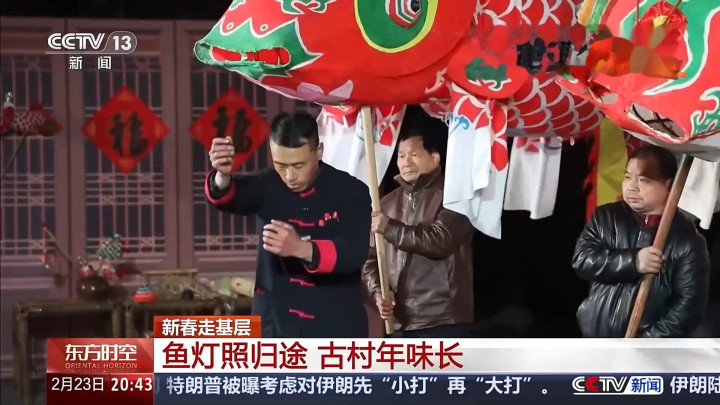 记者刚进村口,就被鱼灯巡游的队伍吸引了。锣鼓震天,鱼灯亮起,四面八方的游客涌来,争相摸鱼头,为新春祈福。